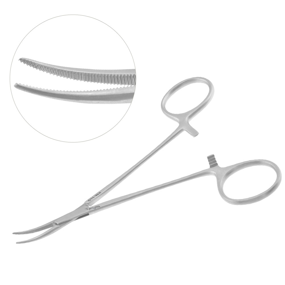 Jacobson Micro Mosquito Forceps Curved Extremely Delicate Size 5" are used as hemostats in surgeries to obstruct and control the blood flow. The finely curved, serrated jaws enable secure grasping in confined spaces with minimal tissue trauma, while the lightweight design enhances clinician control.