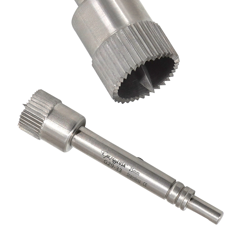 Galt Skull Trephine with Adjustable Centering Point and Detachable Cross-Bar Handle, 25mm, is a specialized veterinary surgical instrument. It is useful for removing circular bone disks from the animal skull.