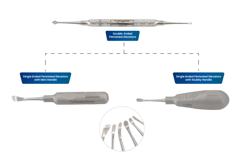The single-ended periosteal elevators are presented in two ergonomically designed handle types: Stubby Handle and Mini Handle, each designed for comfort, safety, and control.