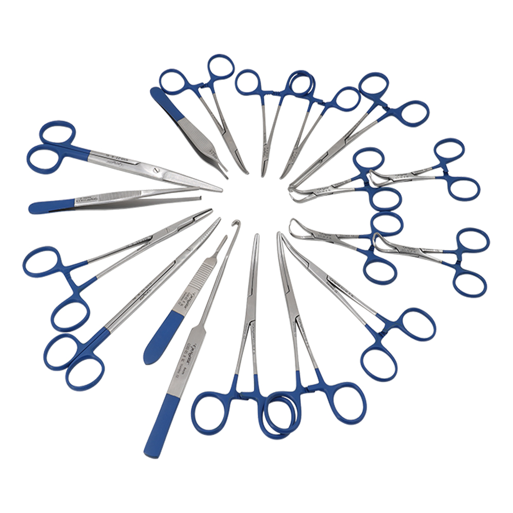 The Canine and Feline Spay Pack, Blue Ring Matte Coated, is made of German stainless steel and includes 18 special instruments designed for spaying both canines and felines. All instruments feature ergonomic designs and enhanced corrosion resistance.