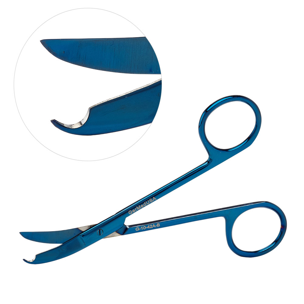 Northbent/Shortbent Stitch Scissors 4 1/2" Blue Coating is used to remove sutures during surgical procedures. It can be used in any surgery. These scissors are suitable for hospitals and other clinical settings. Northbent stitch scissors are autoclavable, have high-tensile strength, and are reusable.