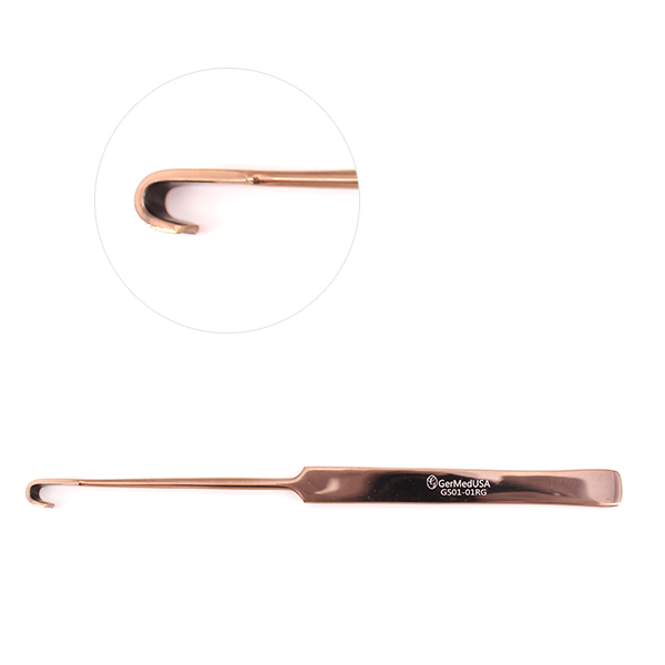 Snook Ovariectomy Hooks 8", Rose Gold are specialized instruments with a curved button tip that are used in neutering dogs and cats. This hook is also available in blue, gun metal, and rainbow colors. Therefore, veterinarians can select from various colors for easy identification during different surgical settings.