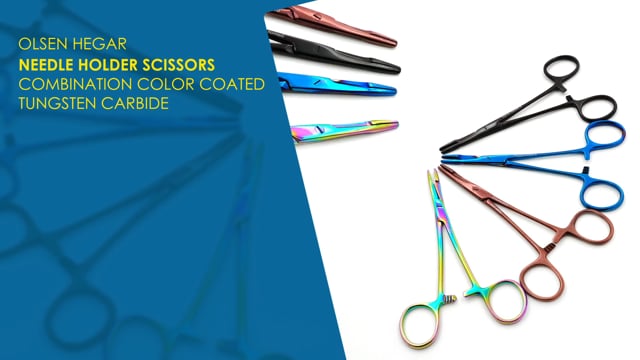 Olsen Hegar Needle Holder Scissors Combination 4 3/4" Serrated - Tungsten Carbide, Rainbow Coated is commonly used for suturing procedures without changing instruments. It also works as scissors and drives needles during the suturing process.